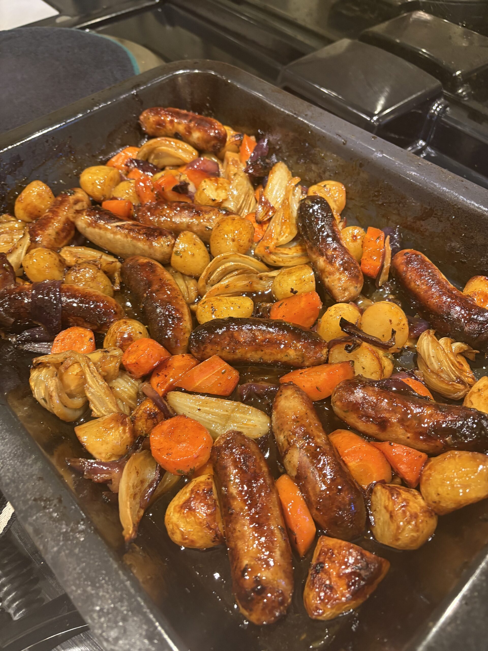 Sticky Sausage Tray Bake 2 large onions (peeled, halved and cut into 4)4 carrots (peeled and roughly chopped)2 large fennel (roughly...